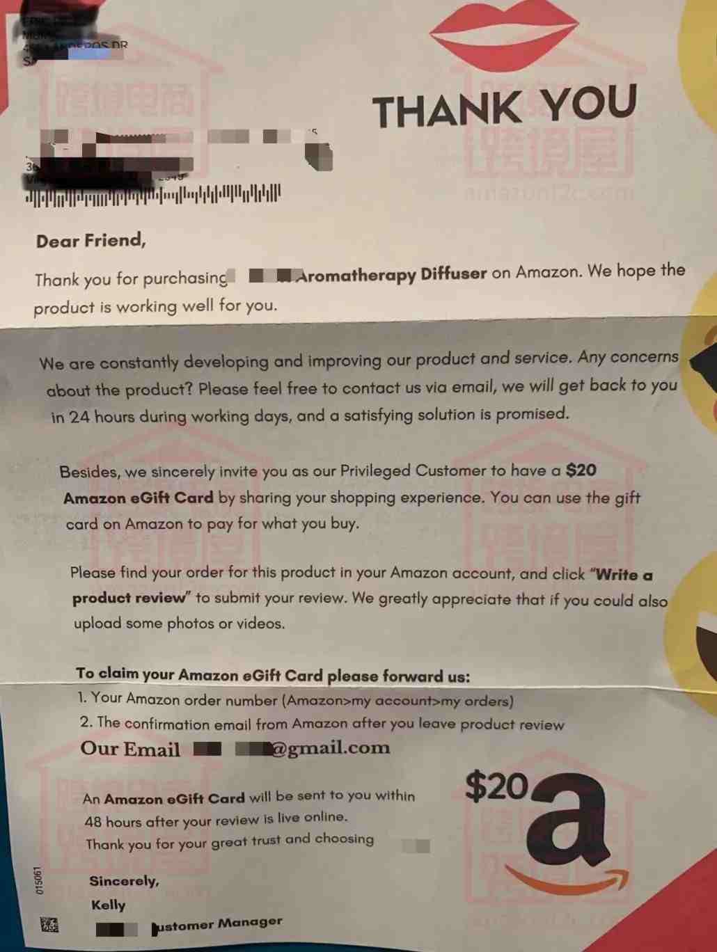 这份香薰机产品索评信的内容,几乎和去年被华尔街日报报道的大卖一样:“只要把购物的订单号和评论生效链接发到指定email,就可以将一张20美元的礼品卡兑现”。