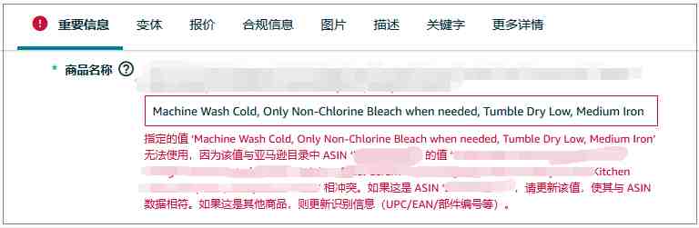 因为当你将title进行全部修改时,系统会默认为你更换了产品,而亚马逊是不允许卖家私自将listing的产品属性进行修改的,这才有了红色字体中的“与该Asin不匹配”的提示。
