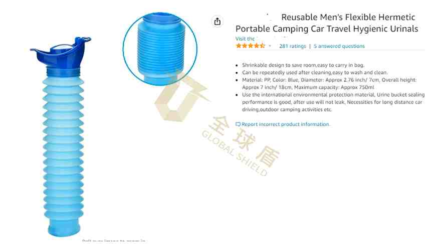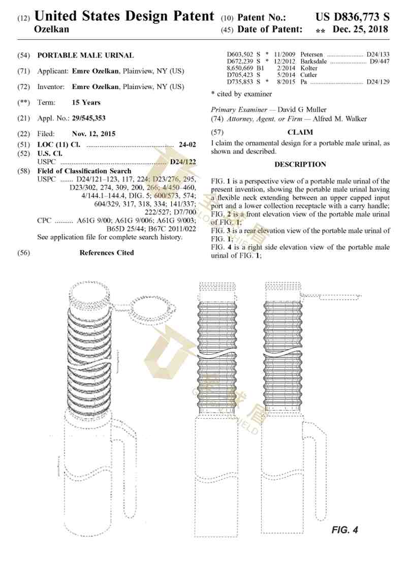 该外观专利的最早申请时间是2015年11月12日,若是在该日期之后上架类似产品则会有侵权风险。该专利保护的是图中的实线部分—可伸缩折叠的管道,展示出了便携式男性小便池具有灵活的颈部,该颈部延伸到上部带盖的输入端口和带有提手的下部收集插座之间。其中上盖开口端口、下部收集插座和提手的虚线仅用来说明用途和环境,并不在专利的保护范围之内。