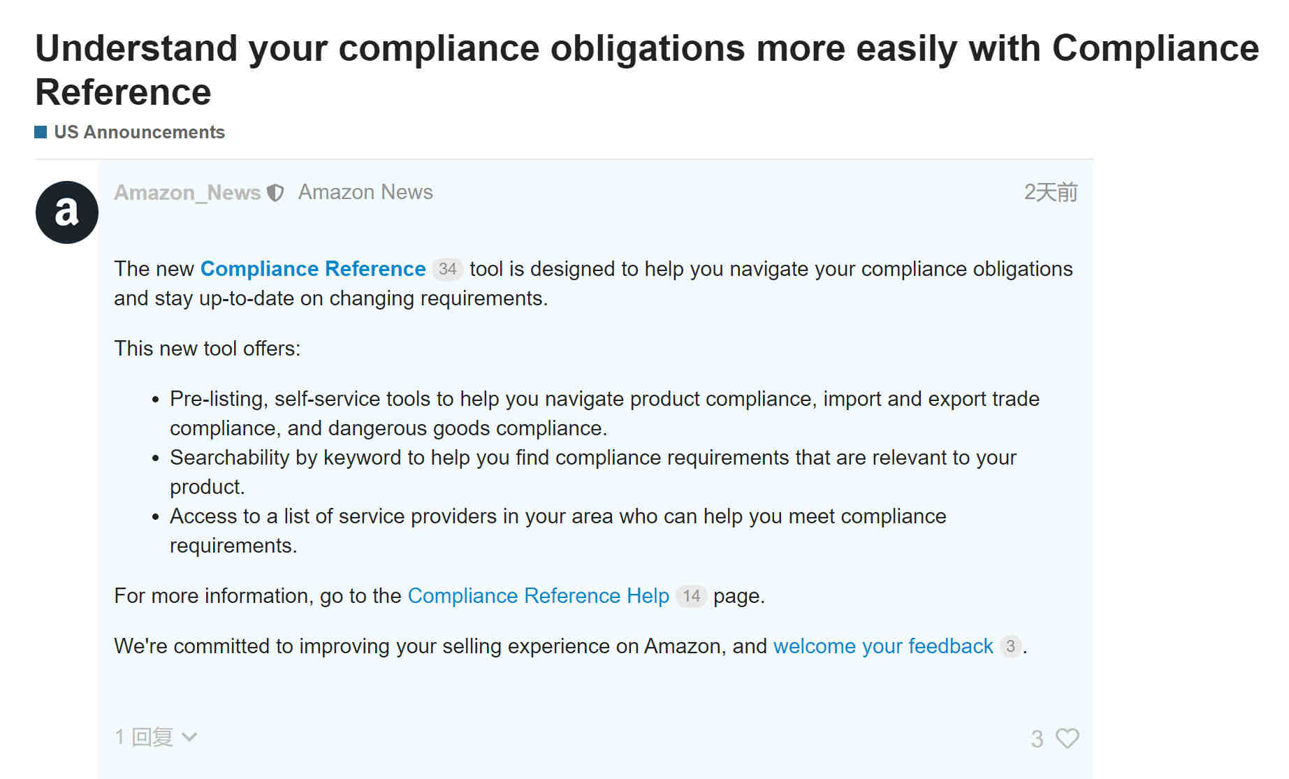 卖方通获悉,亚马逊美国站发布公告称为卖家新推出合规性参考工具,以帮助卖家了解合规义务并提供解决合规性要求的诸多功能,以下是公告内容: