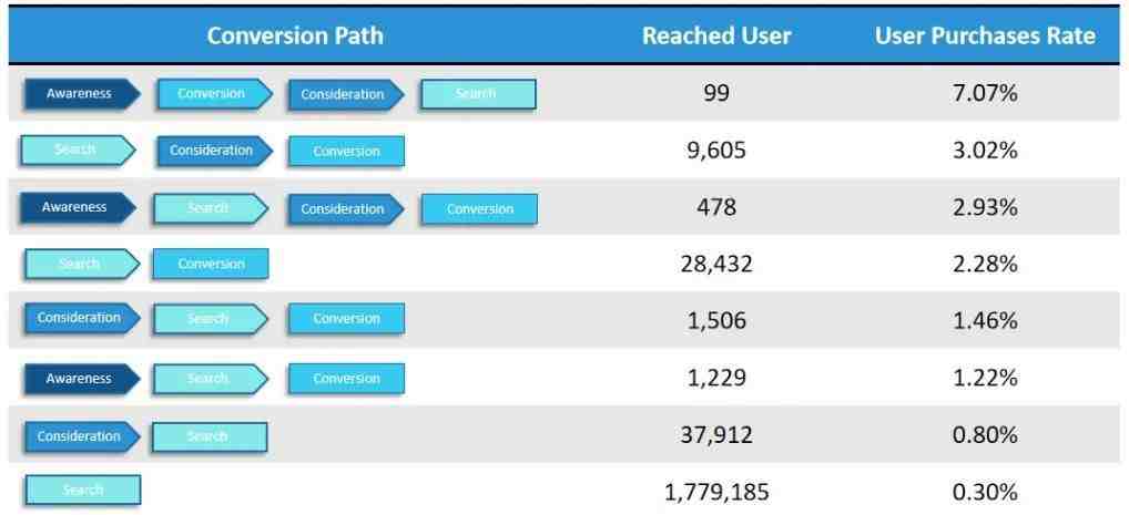 以下数据是用亚马逊新推出的分析工具Amazon Marketing Cloud分析得出的,我们可以看到消费者实际购物路径其实是多样化的。