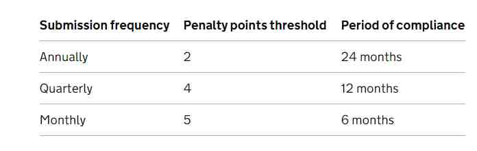一旦达到罚款阈值,纳税人将收到 200 英镑的罚款,并为随后的每次延迟提交额外罚款 200 英镑。延迟提交的罚分阈值将根据提交频率而有所不同。这也意味着如果第一次迟交报表或者迟缴纳税金可能不会有滞纳金,但是会有迟交罚分,一旦罚分积累到阚值,纳税人将会被处罚。以下是罚分阈值,年报,季报,月报的阚值不同。
