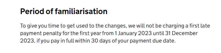 从 2023 年 1 月 1 日起,HMRC 将从付款逾期之日起至全额付款之日收取滞纳金。逾期付款利息按英格兰银行基准利率加 2.5% 计算。