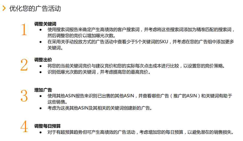 4. 根据广告位竞价和广告策略来增加出单词的曝光和转化。(这个是个难点,需要去下报表总结)