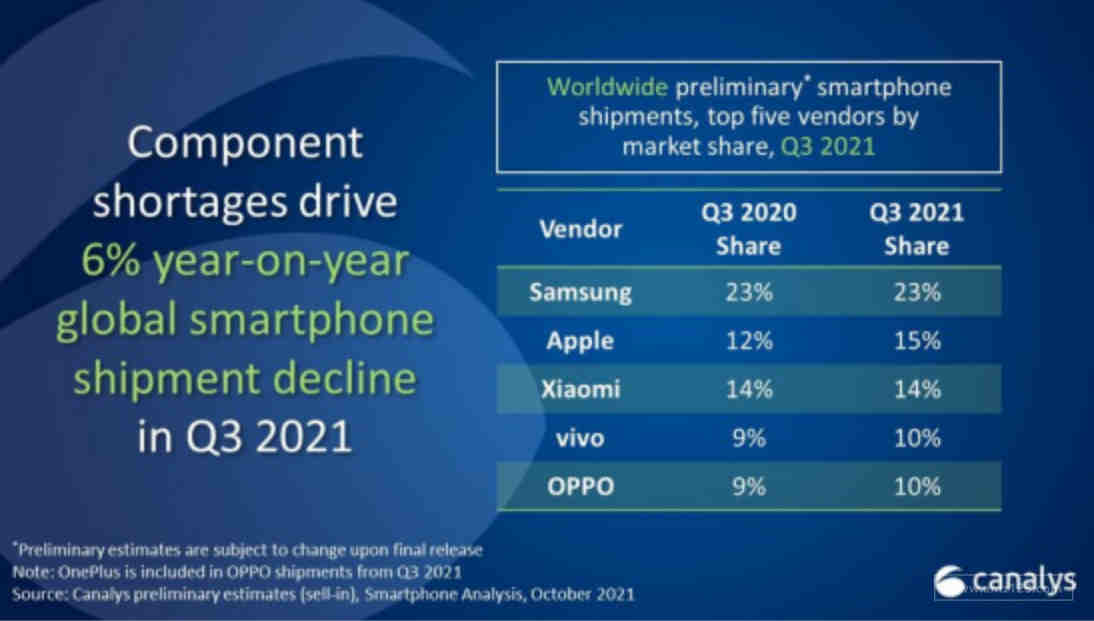 卖方通获悉,根据 Canalys 最新发布的报告,2021 年第三季度全球手机出货量同比下跌了6%,相当于减少了3.28亿部。出货量减少的主要原因是是组件短缺。 其中三星以23%的市场份额遥遥领先,与2020年第三季度的市场份额持平。苹果凭借苹果13系列重回第二,占有15%的市场份额,比去年第三季度的市场份额增加了3个百分点。以1%的市场份额领先小米。2021年第二季度小米以83%的出货量涨幅勇夺世界第二,第三季度的出货量与去年第三季度持平,排名世界第三。 第四和第五的位置分别被vivo和OPPO占据,各占10%的市场份额,都比去年第三季度的市场份额上涨了一个百分点。卖方通了解到,第三季度华为和荣耀无缘前五。以下是详细数据: 小编✎ Estella/卖方通 声明:此文章版权归卖方通所有,未经允许不得转载。