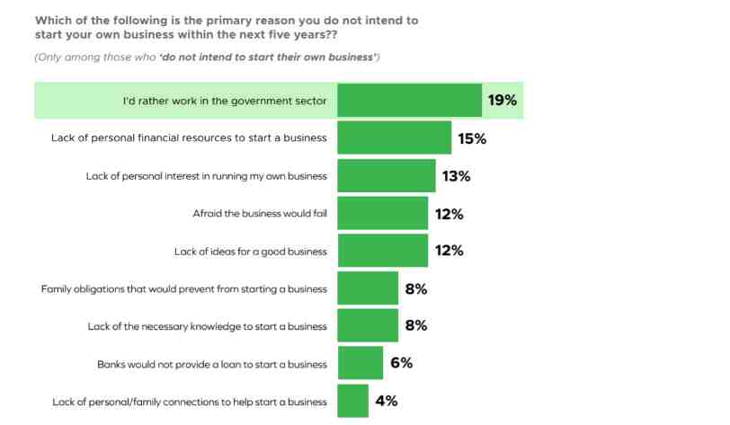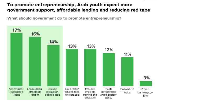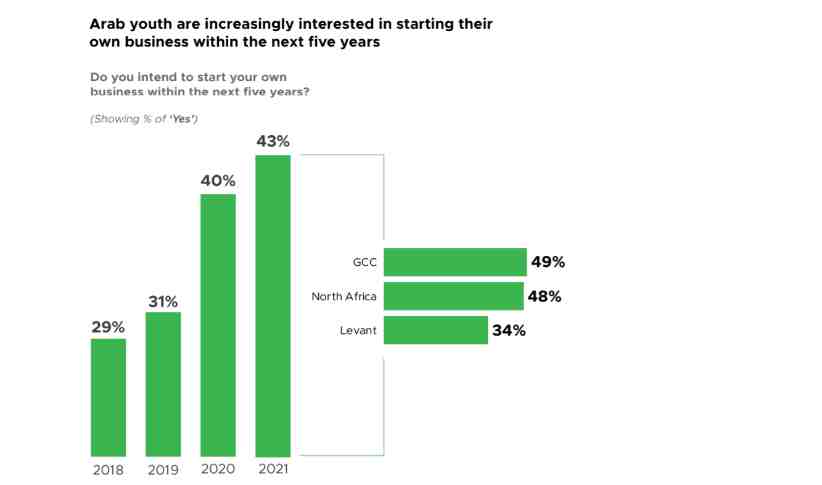 “2021年阿拉伯妇女理事会阿拉伯青年调查”(Asda‘a BCW Arab Young Survey 2021)的调查结果显示,在当今充满挑战的劳动力市场和无法获得高质量教育的情况下,整个阿拉伯世界的年轻人越来越多地将创业视为一条可行的职业道路,并选择正式就业。该调查是周二发布的题为“对未来的希望”的报告的一部分。报告强调,43%的阿拉伯青年打算在未来五年创业,高于去年的40%。这一意愿在GCC(49%)和北非(48%)中最高,但在黎巴嫩、巴勒斯坦和叙利亚等国经济持续受挫的黎凡特(Levant),创业意愿最低,为34%。