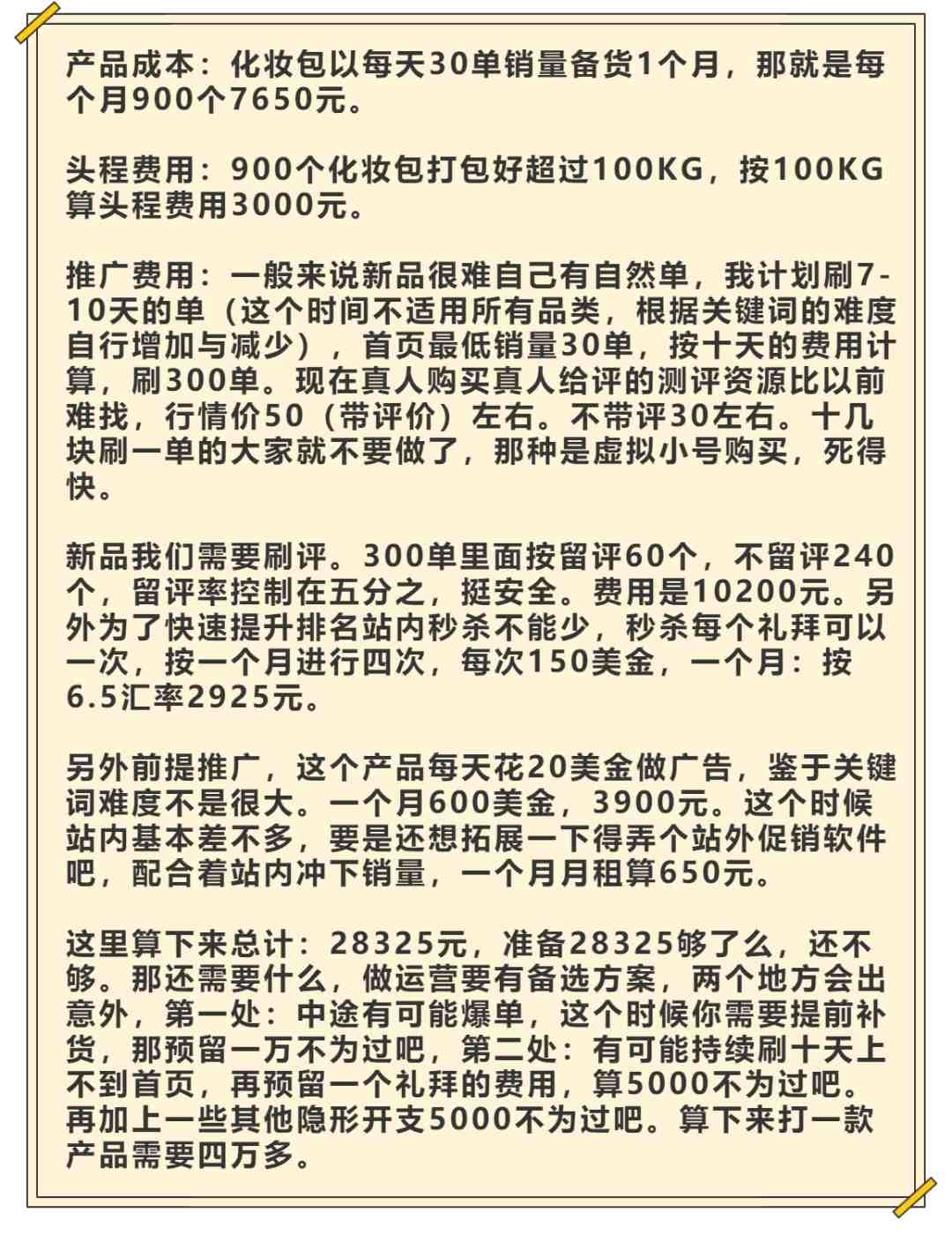 要做预算,就需要知道产品进货价,销售价格,在首页每天最低销量多少,头程费用多少。产品单个重量,和整箱包装重量。
