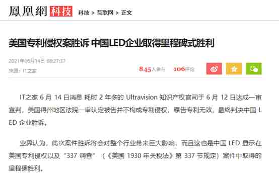 这场胜利虽无比艰难,却扫清了中国LED显示企业在美国及全球市场上的专利障碍,对整个行业带来巨大影响的确值得我们欢呼!