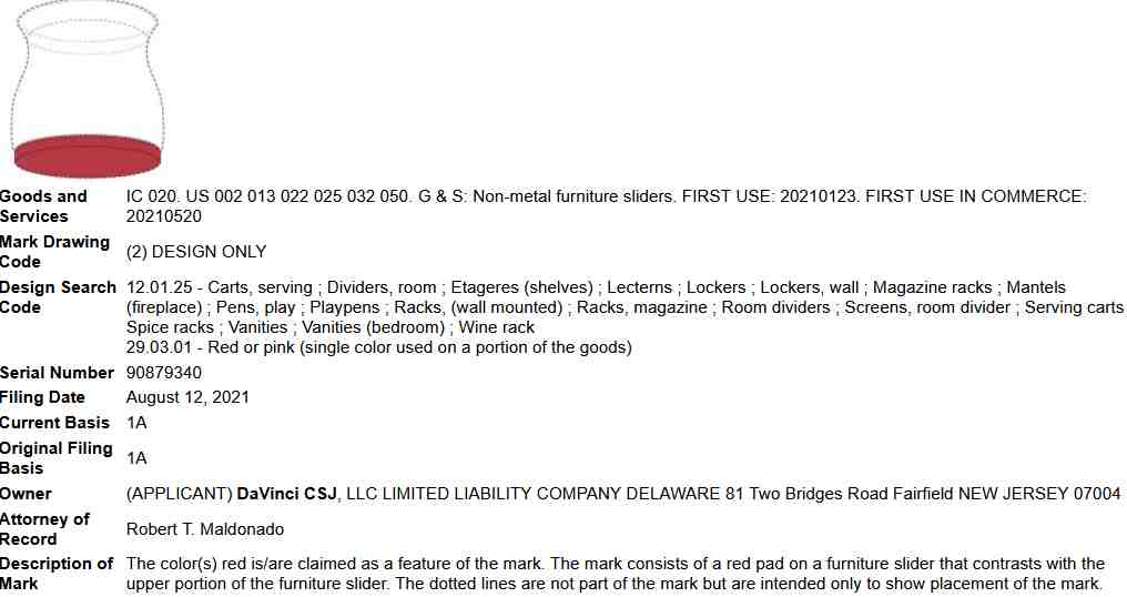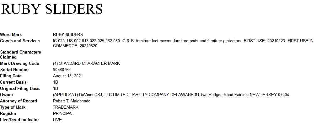 据了解,该案件于2021年9月23日立案,案件号为21-cv-7799,原告品牌是RUBY SLIDERS红宝石家具腿套,是TELEBRANDS CORP公司的产品。这款产品外表看似简单,其实早已被注册了文字商标和外观专利,存在侵权风险!