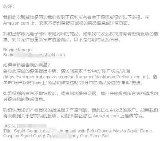 投诉的是版权侵权,这点非常重要。虽然这位朋友把投诉人的联系邮箱打了码,但我们结合产品的标题还是可以判断出来投诉的正是鱿鱼游戏的相关产品。