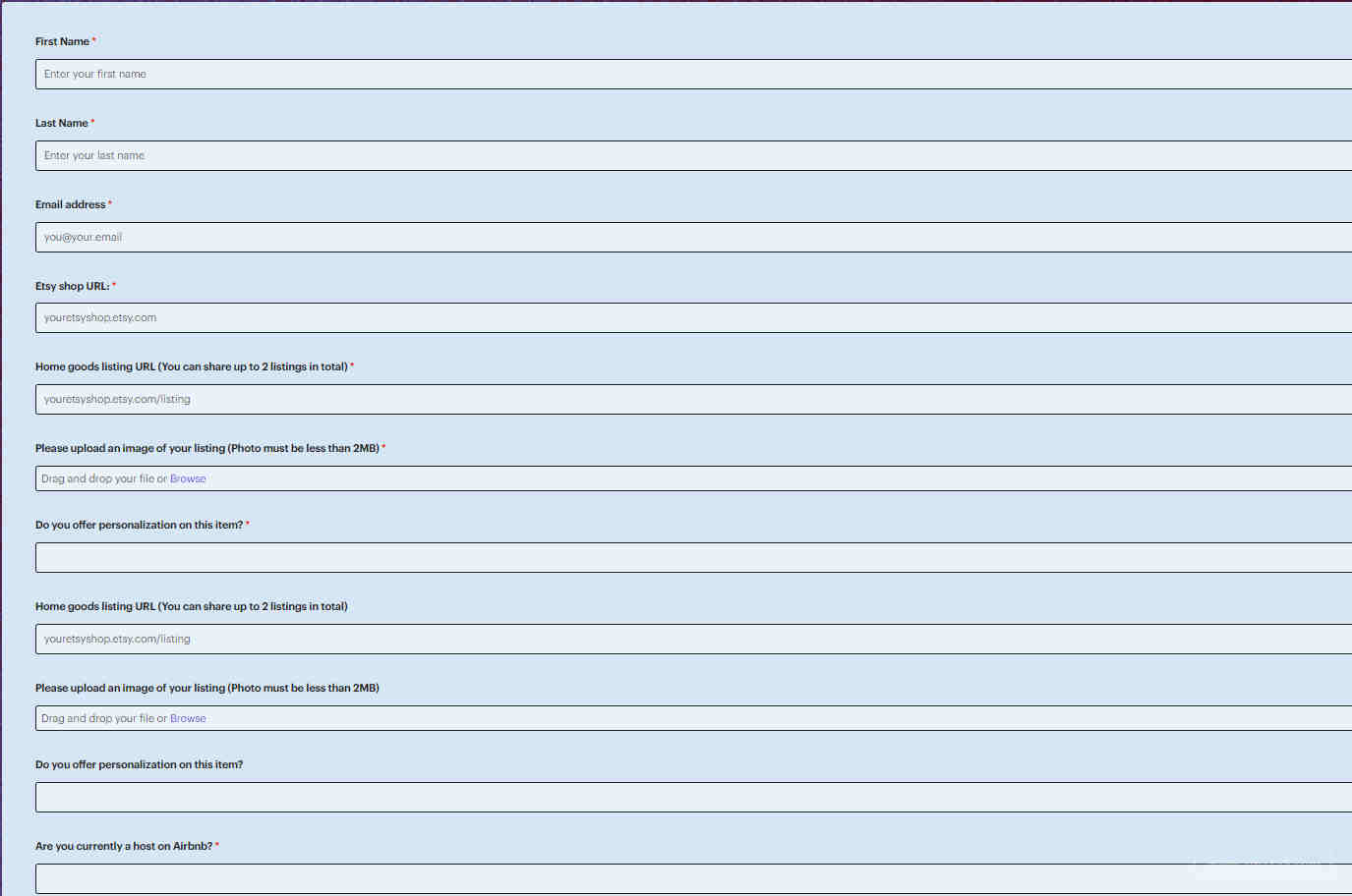 据报道,Etsy在其卖家社区宣传了此次活动,可通过顶部的链接直接转到申请页面。卖家需在10月4日前提交关于申请的信息,包括姓名、邮箱地址、店铺网址以及产品listingURL等等,具体的如下图所示: