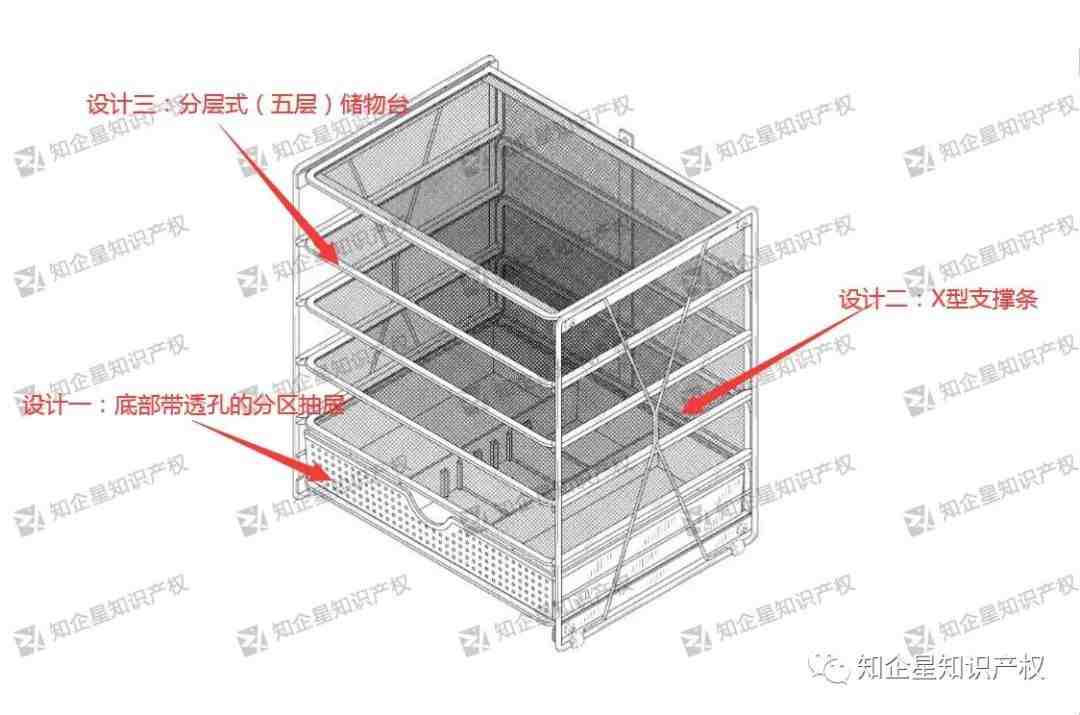 这件产品,相对传统的收纳夹,多了一个底部的抽屉,可以放置一些办公小工具,十分方便,其核心设计点在于:1、底部带透孔的分区抽屉柜;2、侧面的X型支撑条;3、五层储物空间。