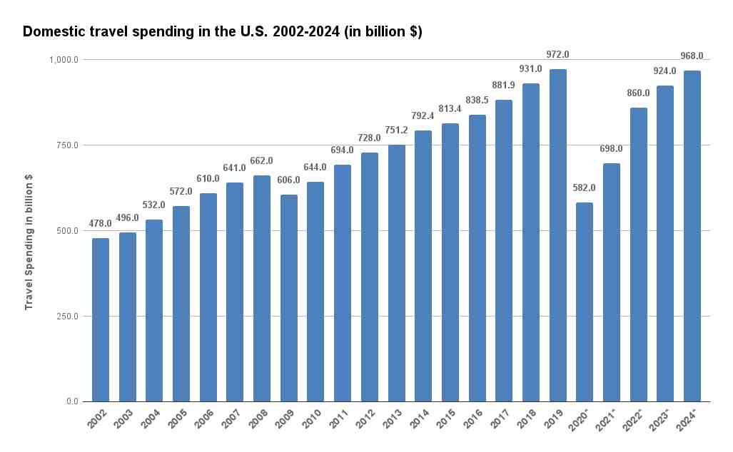 2002 年至 2019 年美国国内旅游支出,预计到 2024 年(以十亿美元计)。