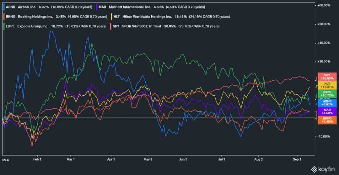 ABNB 股票的表现略好于万豪(纳斯达克股票代码:MAR)和 Booking Holdings (纳斯达克股票代码:BKNG)。然而,其年初至今的表现落后于 SPDR S&P 500 ETF (NYSEARCA:SPY)。
