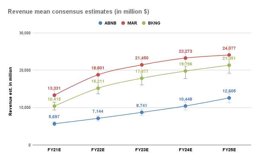 投资者可以轻松获得 ABNB 的超预期营收增长。该公司预计将以 22% 的复合年增长率增长。另一方面,预计 MAR 和 BKNG 的复合年增长率分别为 15.9% 和 19.7%。因此,很明显哪个运营商可能增长更快。
