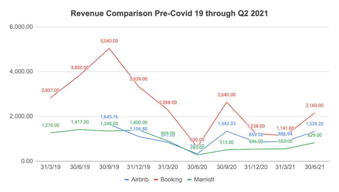 ABNB、MAR、BKNG 的季度收入趋势。数据来源:S&P Capital IQ