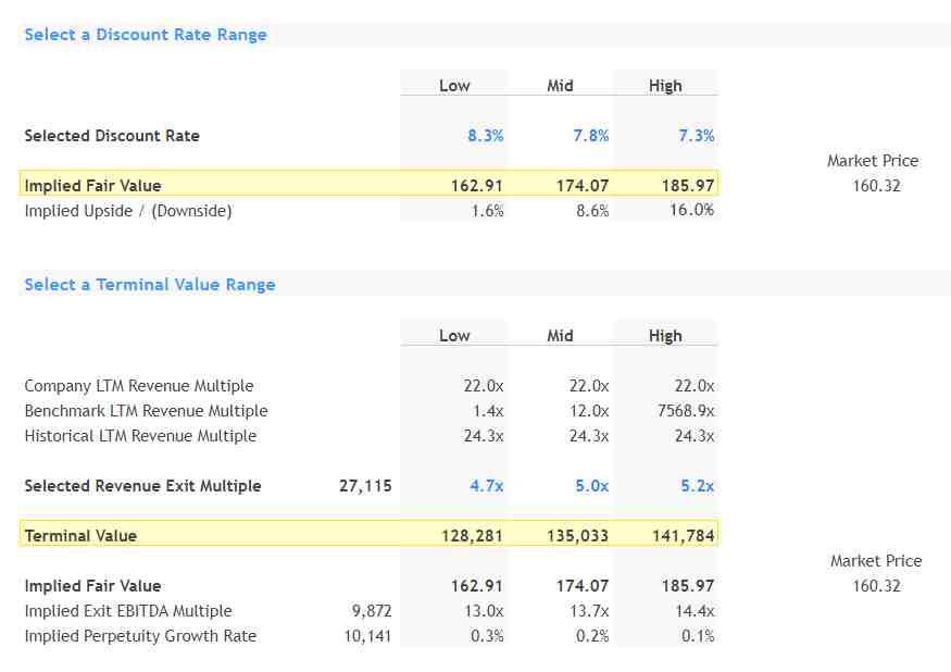 我们在中点得出了 Airbnb 股票的公允价值 (FV) 估计值 174.07 美元。这意味着比上次收盘价有 8.6% 的潜在上涨空间。我们的估计基于 DCF 框架,退出收入倍数为当前行业的 EV/Fwd Rev 平均值的 5 倍。