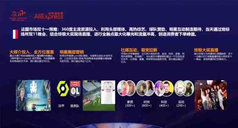速卖通法国商家商品运营负责人杨宁表示,今年双十一,速卖通会在法国首次结合线上线下综艺、体育、娱乐等全渠道围绕双十一进行一系列的宣传。包含目前已经确定的排名第一的综艺节目《荒野求生》,法国最负盛名的里昂足球俱乐部官方合作,还会在法国地标性建筑进行线下的快闪活动,超过1000个头部网红联合造势。