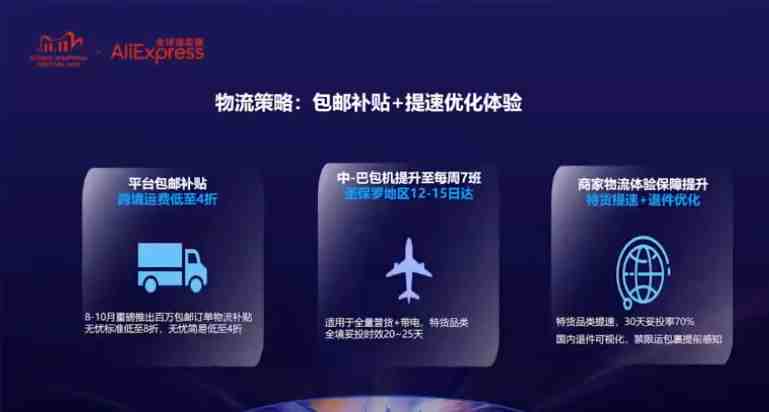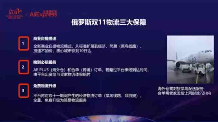 保障上,速卖通会推进把俄罗斯的包裹从经济和简易升级为自提,物流时效将得到巨大的提升,特别是经济型和简易型的物流方式,原本时效可能是30天、40天,速卖通会把它提升到重点城市只需10天左右,如果在非重点城市偏远地区也能做到15—20天。