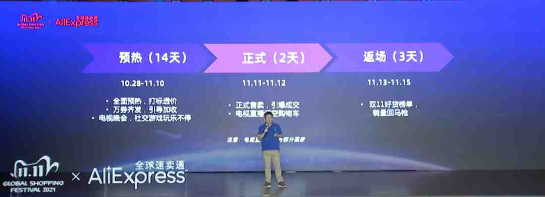 据了解,从10.28-11.10就进入双十一的预热阶段,正式期是在美国西部时间11月11号的0点开始,维持48小时,之后将通过双十一好货榜单进行3天的返场。
