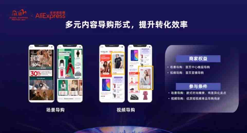 除了以往的会场形态之外,此次将强化场景导购的概念。商品的聚合,用场景化的方式让用户发现更多好的商品。同时速卖通也会重视视频和短视频的导购,指导卖家在日常的店铺装修当中用短视频去介绍自己商品的特色。