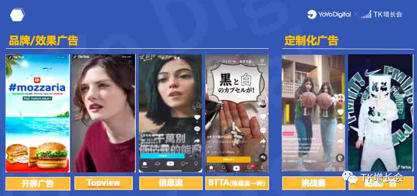 目前TikTok主要有6种广告展现形式,分别是开屏广告、topview、信息流、BTTA、标签挑战赛和贴纸广告。