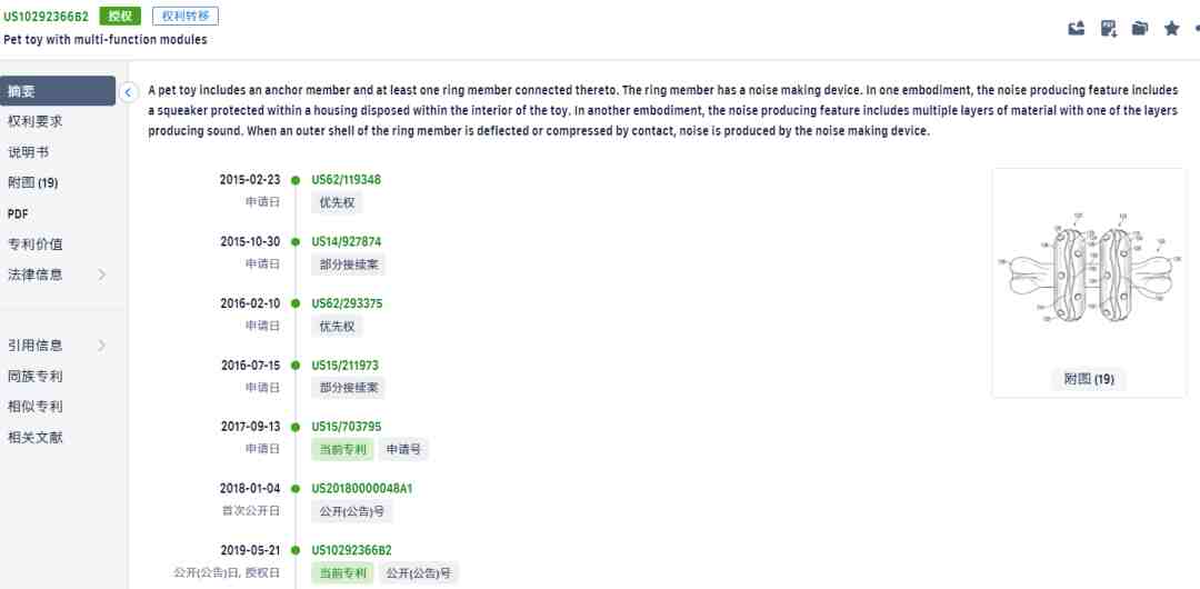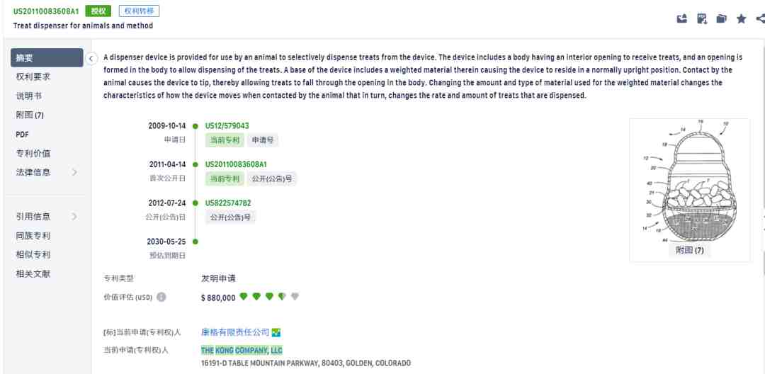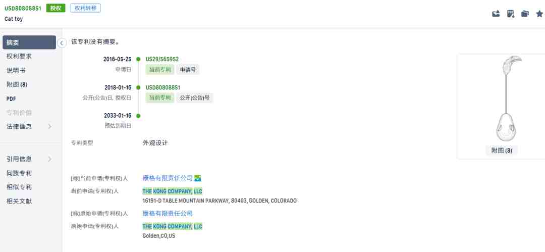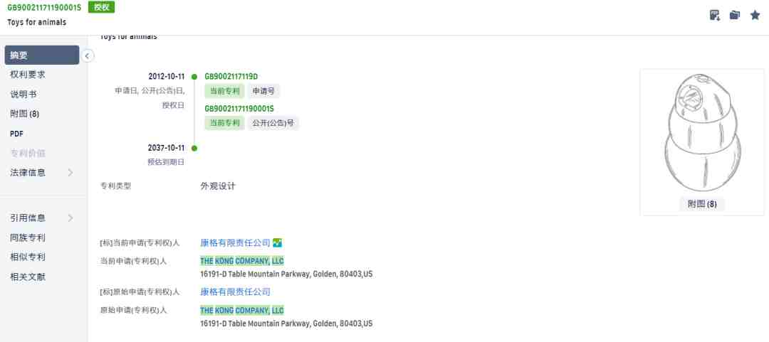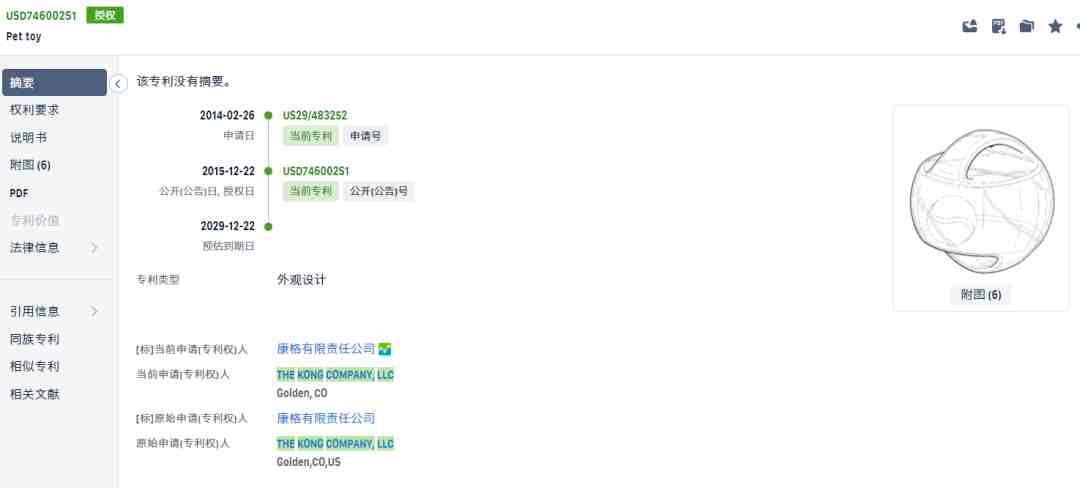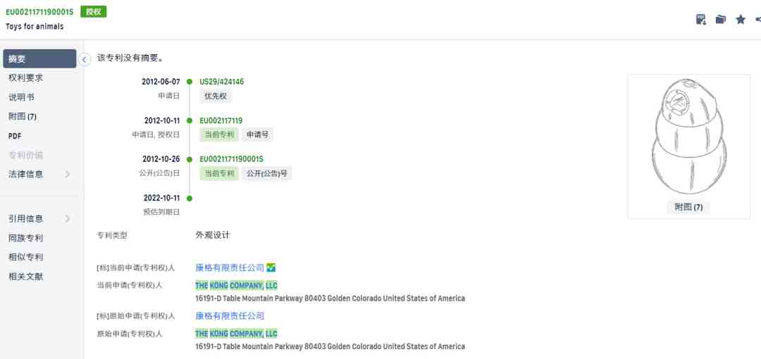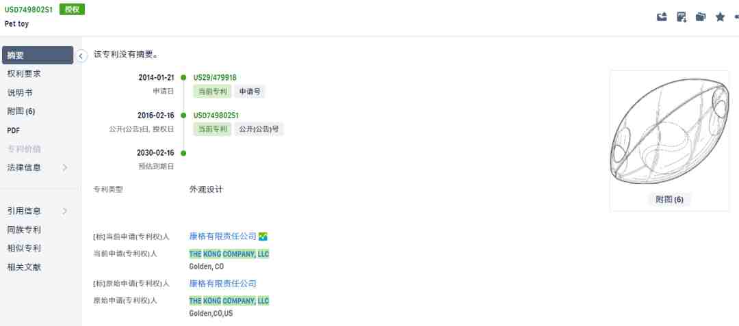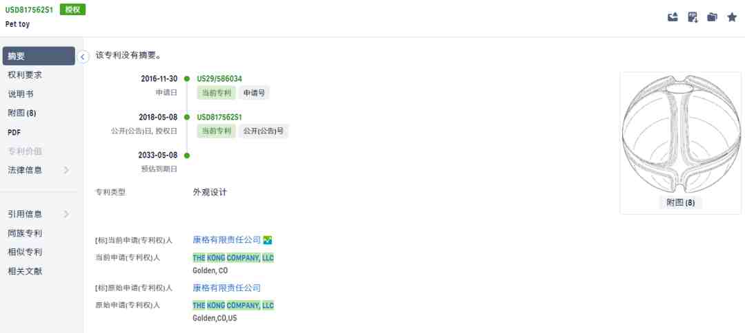 kong旗下也拥有很多专利注册,主要是各种宠物玩具。