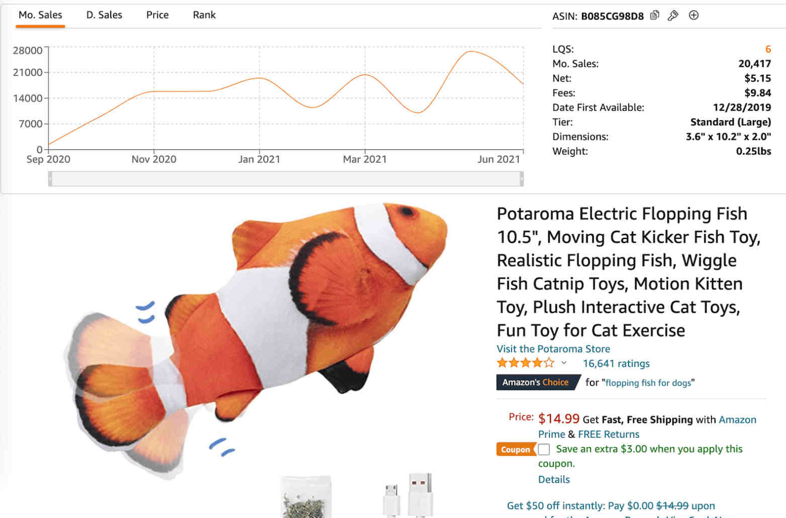 电动玩具:猫咪智能机器人互动玩具电动小丑鱼,正在成为亚马逊上的畅销产品,月销量为数万。