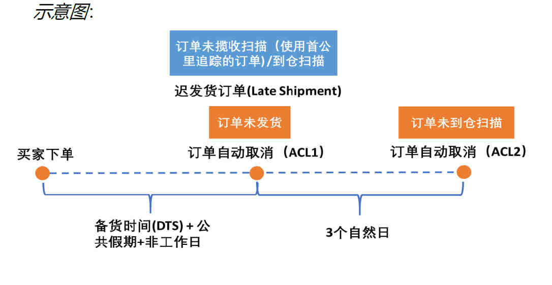 如果卖家没有在 DTS 日内“点击发货”,或者订单没有在 DTS+3 个自然日内到仓扫 描,订单会被系统自动取消(auto-cancellation),影响卖家的订单未完成率(Nonfulfilment rate),会被罚分。