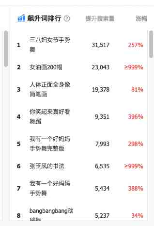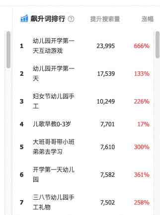举个例子,比如你是做少儿艺术相关培训的,我们通过分析工具可以发掘出以下这些词最近搜索量在暴涨,比如过节期间,小朋友就有各种学手势舞的需求。