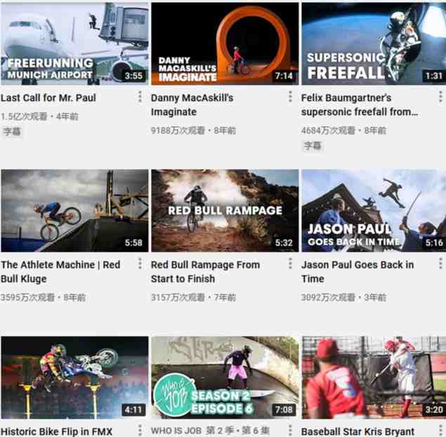 而另一家饮料企业“红牛”,并没有请一线超级巨星代言,而他们在社交平台却有超1200万粉丝,比前两者的合还要多,打开红牛youtube上的主页,是这样的画风: