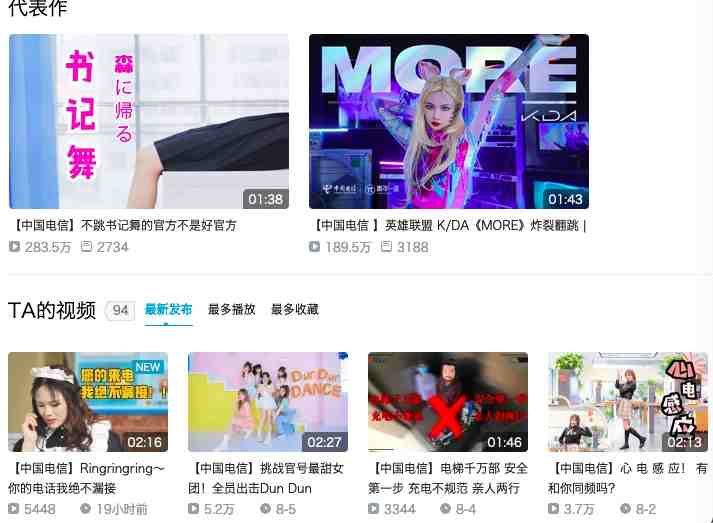 一些大企业在做内容营销的时候,也常忽略这一点。就拿我们的三大运营商来说,现在也越来越重视去年轻人聚集的平台做品牌布局。比如我们打开电信的B站主页,是这样的画风。