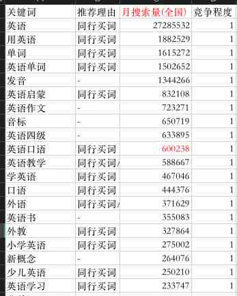 比如我们搜英语口语相关词,从巨量后台导出的表格相关词是这样,这个月60多万的数据就有点高的离谱。