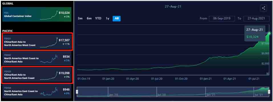 根据波罗的海货运指数(FBX),从亚洲到美国东西海岸的运价强劲反弹,到美国西海岸的价格一周内上涨了超950美元至18,425美元/FEU,上涨幅度达到4.9%,比去年同期上涨了552%以上。