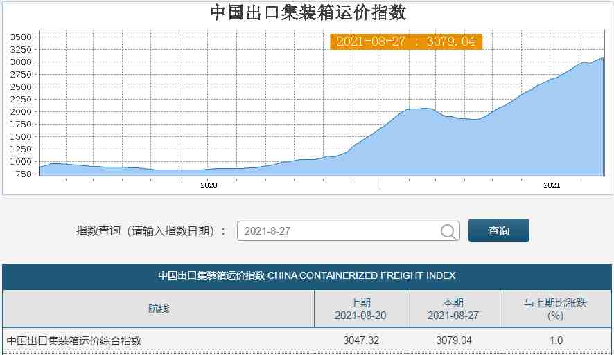 根据上海航运交易所指数显示,中国出口集装箱运价指数CCFI:3079.04点,较上周比涨跌(%):+1%;上海出口集装箱运价指数SCFI:4385.62点,较上周比涨跌(%):+1%。