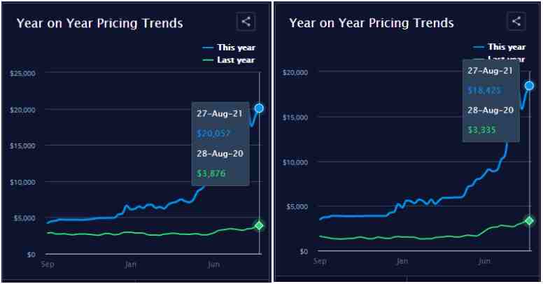 与此同时,到美国东海岸运费价格也不甘示弱,价格一周内上涨了超900美元至20,057美元/FEU,上涨幅度达到5%,比去年同期上涨了517%以上。