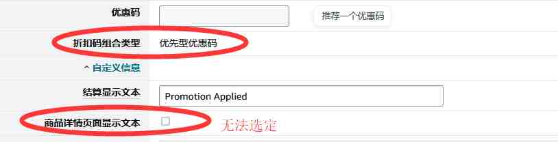 当你选择一次性Code时,商品详情页面是无法展示这个购买折扣信息的,下面的“商品详情页面显示文本”无法选定。