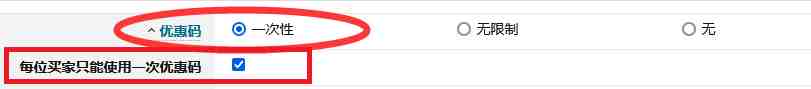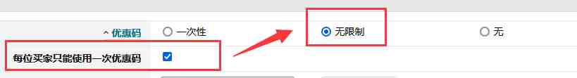 当你选择无限制code时,下面还是会出现“每位买家只能使用一次优惠码”的选项。