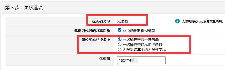 2、一次结算中的无限件产品,就是说这个码在这个订单中能购买无限次特定的Asin产品。(不太稳妥,一个订单可以把你某促销Asin扫光)