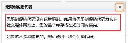 现在最新的社交媒体促销比之前有了细微的改变,现在社媒Code不再可以选择优惠码类型(以前可以选择),只能选择下方的兑换次数。