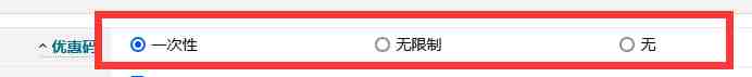 无论你上面选择为本产品打折,还是为其他产品打折,这里都会有三种优惠码类型:一次性、无限制、无。