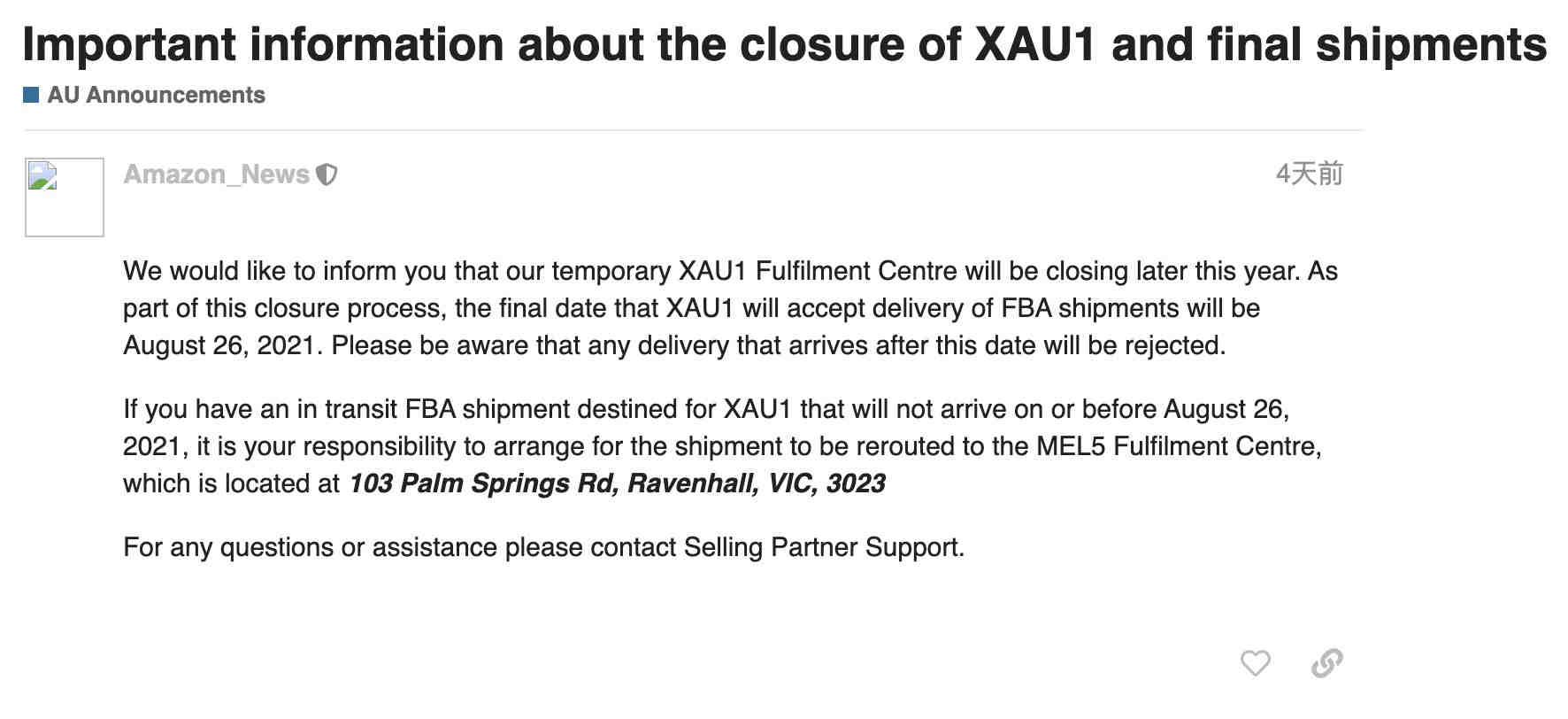 卖方通获悉,日前亚马逊澳大利亚发布公告,宣布其澳大利亚仓库XAU1将在8月26日后停止收货,提醒卖家提前做好准备。