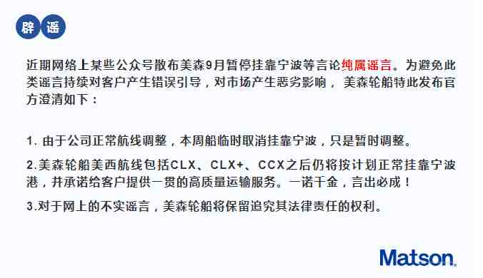 美国货运代理公司Flexport也表示,从上海出发,经洛杉矶和长滩港到芝加哥的运输时间已经从35天增加到了73天。这意味着,一个集装箱从始发港出发,再回到始发港,大约需要146天,相当于市场上的可用运力减少了50%。而一个集装箱从船上被装卸到码头火车上所需的时间,在西雅图是18天,在奥克兰是两周,在萨凡纳港则是一个多星期。海运延误耽误了相当于所有跨太平洋运力的25%,而需求同期又猛增了25%。近期网络上某些公众号散布美森9月暂停挂靠宁波等言论纯属谣言。为避免此类谣言持续对客户产生错误引导,对市场产生恶劣影响,美森轮船发布官方澄清如下:1.由于公司正常航线调整,本周船临时取消挂靠宁波,只是暂时调整。2.美森轮船美西航线包括CLX、CLX+、CCX之后仍将按计划正常挂靠宁波港,并承诺给客户提供一贯的高质量运输服务。一诺千金,言出必成!3.对于网上的不实谣言,美森轮船将保留追究其法律责任的权利。