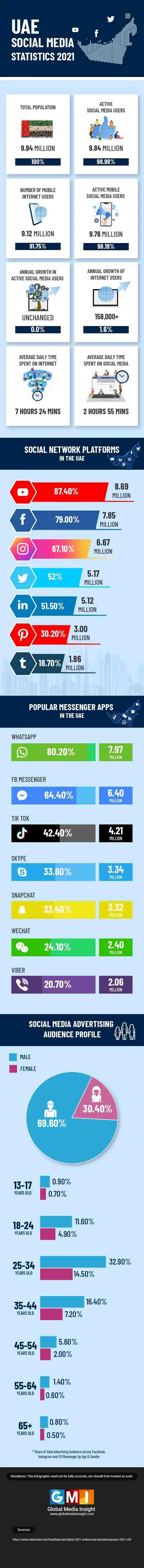 在阿联酋的人口已采取社会化媒体如鱼水。阿联酋人平均每天在社交媒体上花费 2.57 小时。与世界其他地方非常相似,社交媒体已成为阿联酋日常互联网使用中最重要的部分之一。它为被忽视的人发出了声音,并成为各种思想的大熔炉。