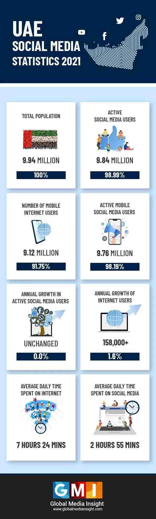 根据最新统计数据,高达98.98% 的阿联酋人口仍然活跃在社交媒体上。这意味着到 2021 年,在 994 万人口中,几乎每天都有 984 万人关注社交媒体。2021 年,阿联酋的互联网用户年增长率为1.6%。社交媒体的使用量与上一年相比保持0.0 % 不变。