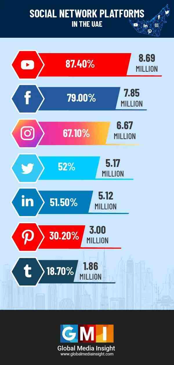 YouTube 是2021 年最受欢迎的社交媒体平台,拥有 789 万用户。阿联酋几乎79 % 的人口在 Facebook上都有个人资料,而YouTube 的渗透率也达到 87.40%。