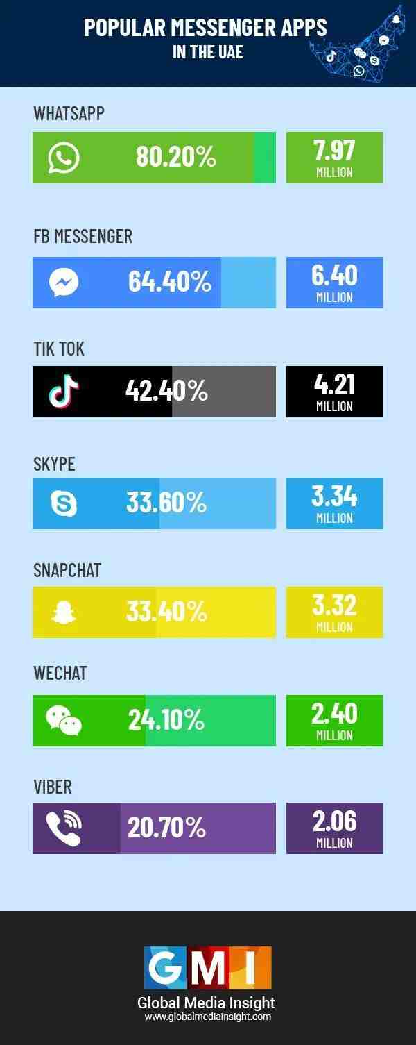 可以预见,WhatsApp 是阿联酋最受欢迎的聊天应用程序。WhatsApp在阿联酋拥有797 万用户,占该国总人口的 80.20%。FB Messenger拥有640 万用户,在阿联酋人口中的渗透率为 64.40%,位居第二。尽管服务经常中断,Skype 仍然以 334 万用户名列第三,而在青少年中真正流行的Snapchat拥有332 万用户。在 2020 年社交媒体聊天应用程序列表中排名第五的是拥有240 万用户的微信。