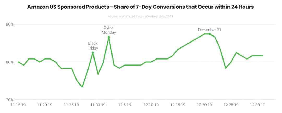 数据展示的是,去年2019年黑五网一和圣诞节前的广告点击后24小时内转化的曲线。