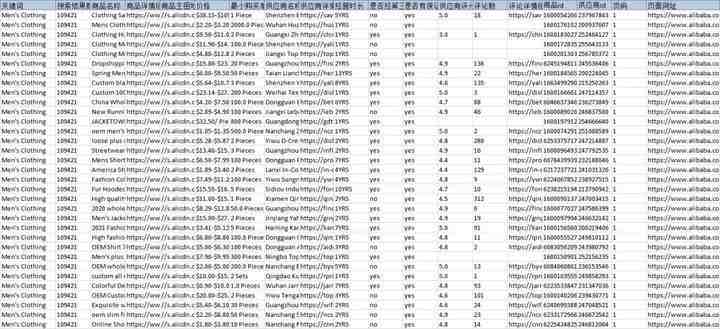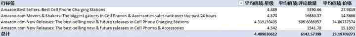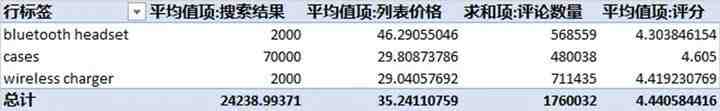 然后通过excel对数据进行透视分析,得到不同关键词对应的搜索结果/价格平均值/评论数量/评分平均值等。
