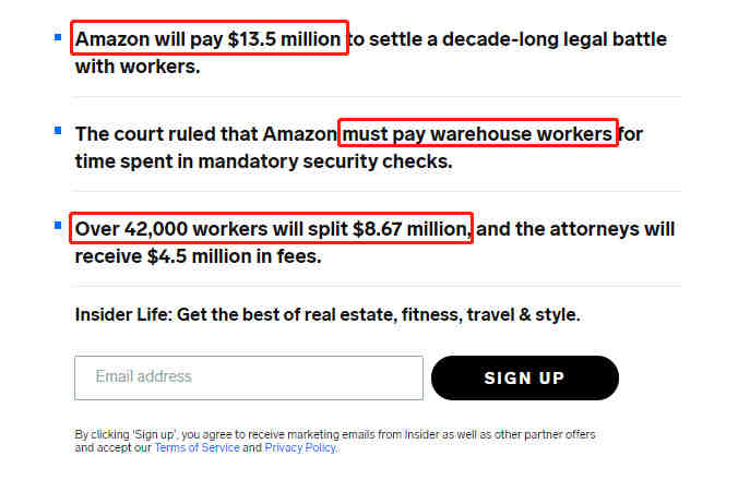 判决结果显示,亚马逊将为该案件涉及的42000多名员工支付总计1,350 万美元的赔偿金,而这些员工的律师将分走其中的450万,员工分得867万美元,最高的一笔为5760美元。